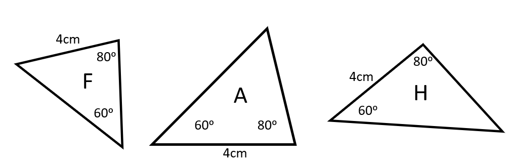 A and H are congruent using the ASA test (two angles that are the same, and one corresponding pair of sides).