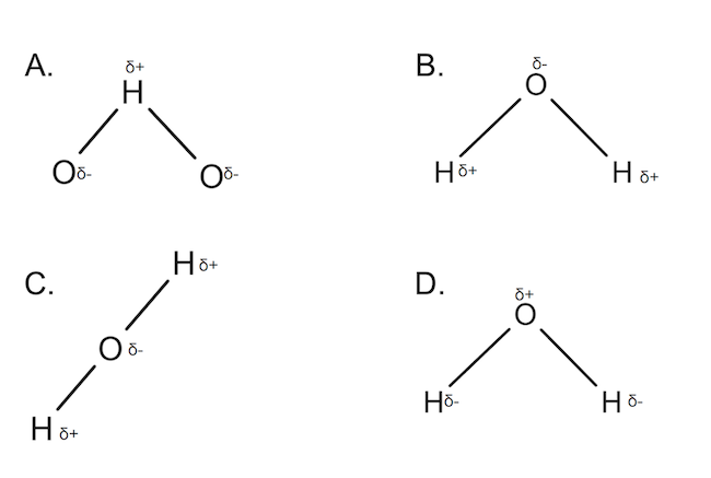 Which part of a water molecule has a partially negative charge and a partially positive charge