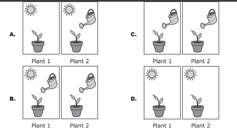 A student states that plants need sunlight to grow. The student plans an investigation to help support the argument with evidence. The diagrams represent four different setups. Which setup will give the most evidence to support the student’s claim?