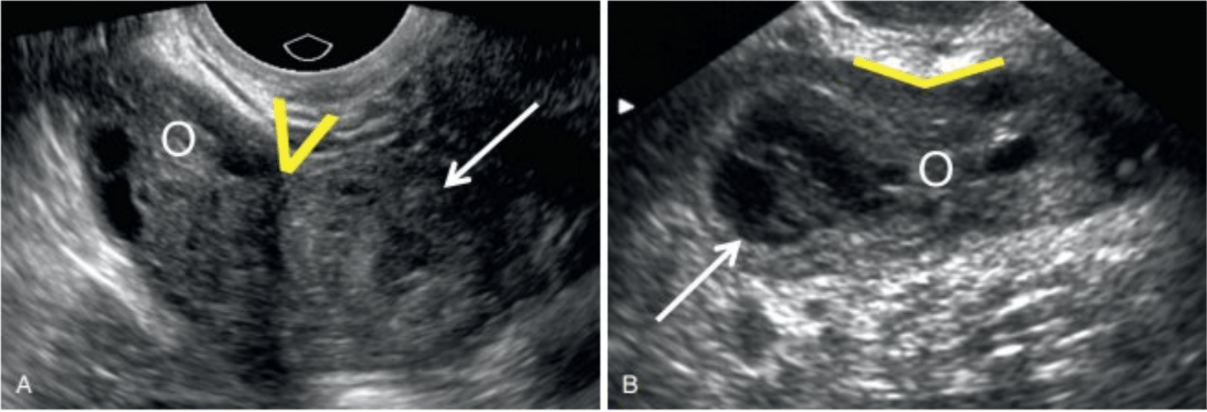 Exert gentle pressure with the transducer or on the anterior abdominal wall to attempt to separate the ectopic pregnancy from the ovary. angle between the ovary and the ectopic pregnancy will be acute because they are adjacent separate structures. Angle will be obtuse between the corpus luteum and the ovary, because the exophytic corpus luteum protrudes from the ovary and exhibits the claw sign.