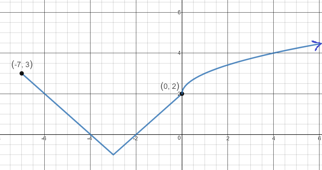g(x)={(abs(x+3)-1,if -7<=x<0),(sqrt(x)+2, if x>=0):}