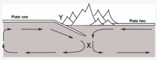 This is a convergent boundary. Plate one is more dense so it is subducting underneath plate two. At point X, Plate one is melting into magma (molten rock). Magma is melting through plate two causing a volcano to form at point Y.