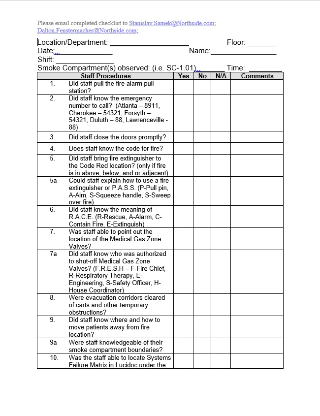 1. PUT ON YOUR VEST 2. HORIZONTALLY EVACUATE TO THE NEXT ADJACENT SMOKE COMPARTMENT 3. GO RENDER AIDE AND ASSISTANCE 4. WALK MY SMOKE COMPARTMENT 5. COMPLETE AND SEND FIRE DRILL CHECKLIST