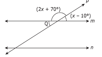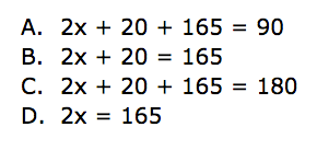 The measure of <Q is 2x + 20 degrees, and the measure of <R is 165 degrees.  The angles are vertical to each other.  Select the correct equation.