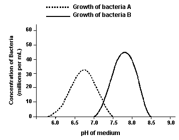 The graph shows the growth curves for two types of bacteria (A and B) under different pH values.