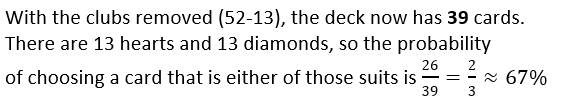 Before shuffling a deck of cards (no jokers), Mike removed all of the clubs.  He shuffled them and asked Jaime to choose one at random.  What is the probability that the card she chooses will be either a diamond or heart?