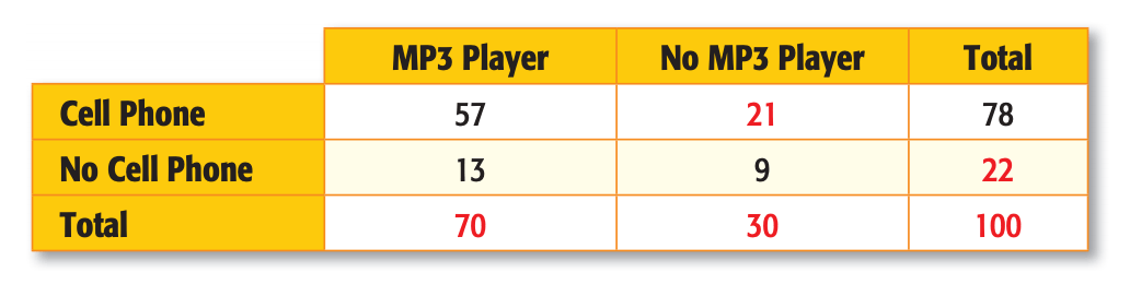 Determine the probability of a cell phone, given no MP3 player.