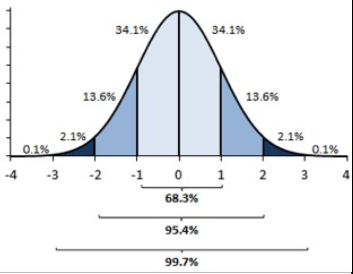 A scientific study arrives at a mean of 500 and a standard deviation of 25. Find the percentage of data that falls between 425 and 475.