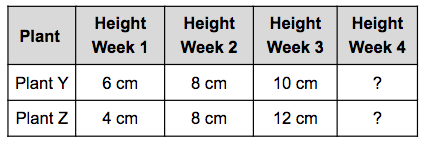 A group of science students observed and recorded the growth of two plants for four weeks. The table shows their data.