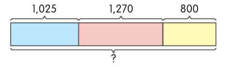 Answers will var but should include 1,025 + 1,270 + 800 = ?