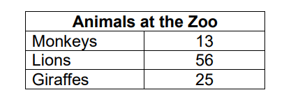 Joshua went to the zoo. He saw lions, monkeys, and giraffes. How many animals did he see?