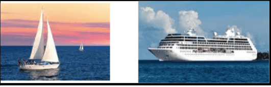A sailboat is used for quick trips, on the other hand, a cruise ship is used for extended trips going to far places.