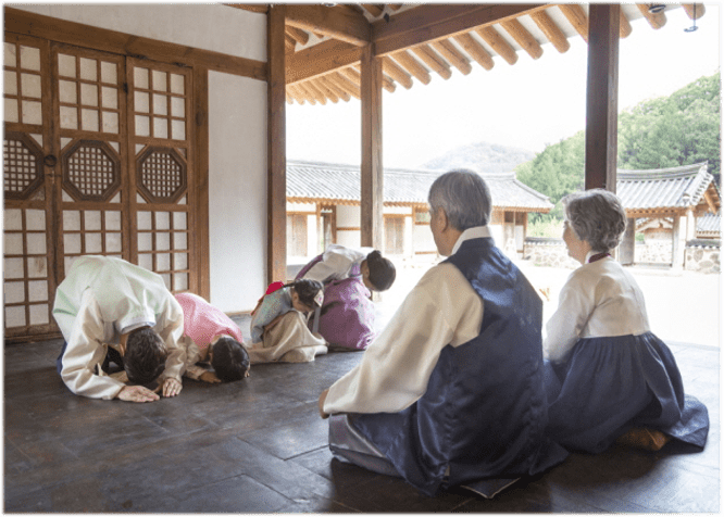 전통 옷 한복을 입고 멀리 떨어져 지내던 사촌들이 모여 서로 웃으며 하는 전통적인 인사