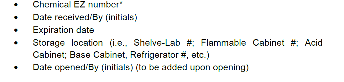 Name 3 Items that should be on a Chemical Container (from EZ Labs)