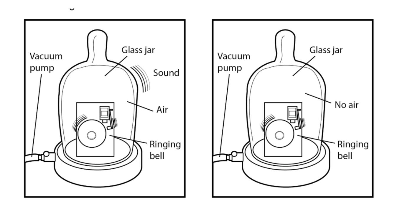A ringing bell makes noise inside a glass jar. Then the air is removed from the glass jar using a vacuum pump. When all of the air leaves the jar, the sound of the ringing bell can no longer be heard. Which of the following best explains why the students can no longer hear the bell?