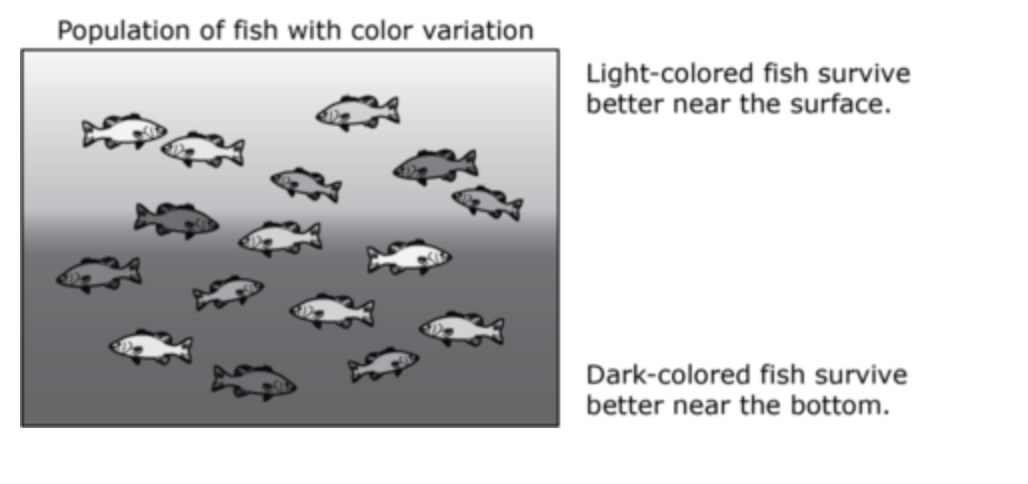 A population of a certain kind of fish is introduced into a new habitat. These fish have variations in color from light to dark. Because of the lighting conditions and predators in this new habitat, light colored fish survive better near the surface and dark-colored fish survive better near the bottom.