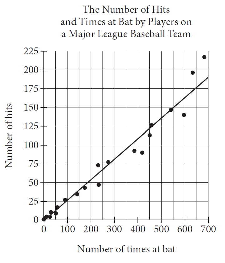 For the player with 450 times a bat, the actual number of hits the player had is approximately how many fewer than the number of hits predicted by the line of best fit?