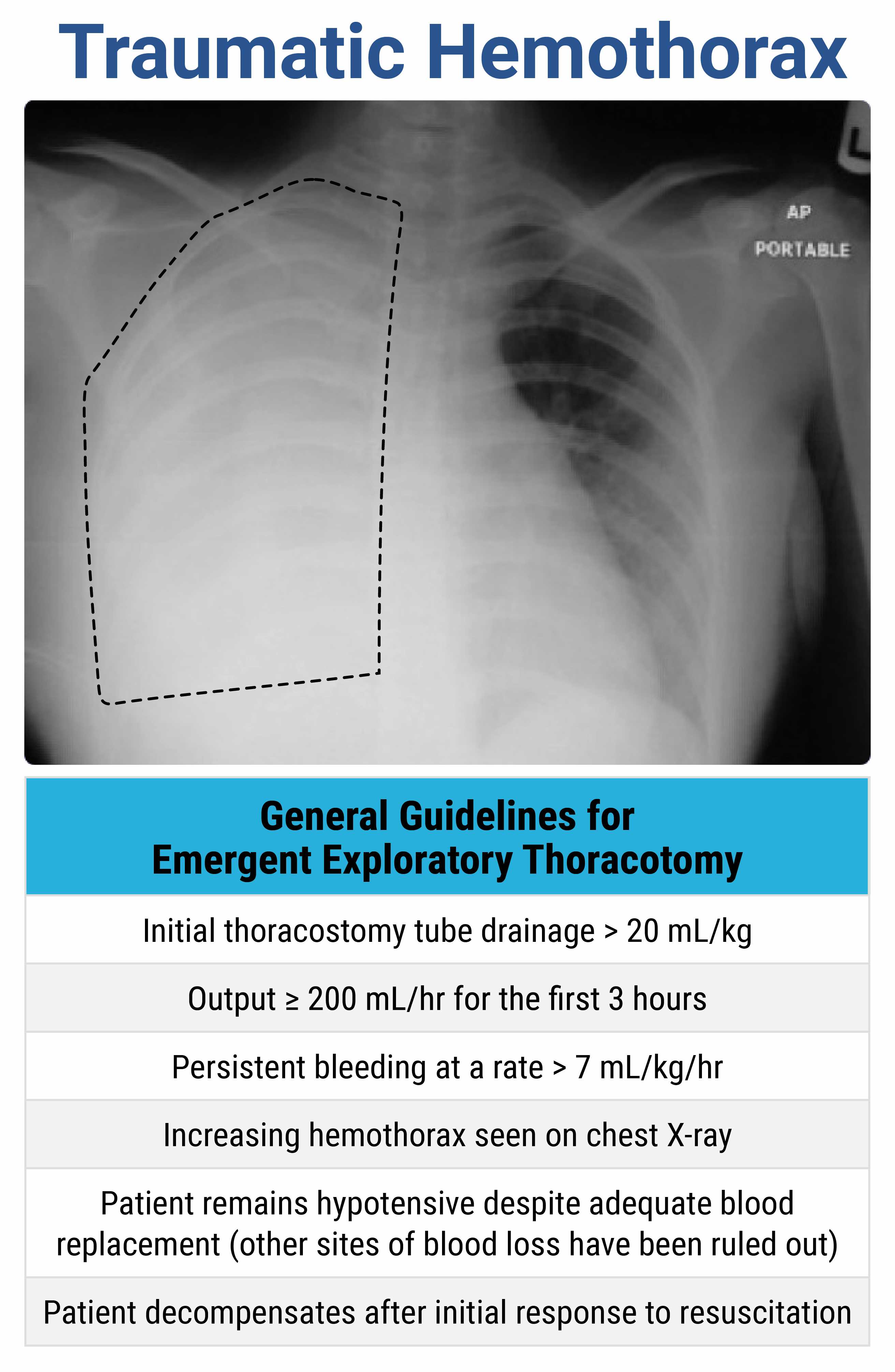 List at least 4 of the indications for thoracotomy after chest tube placement for hemothorax.