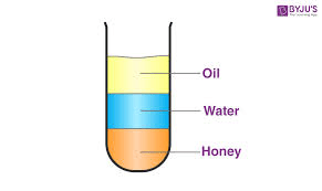 If oil has a density of 0.92 g/mL, water has a density of 1.0 g/mL and honey has a density of 1.42 g/mL. Where would an object with a density of 1.23 g/cm3 be located if placed in this test tube?