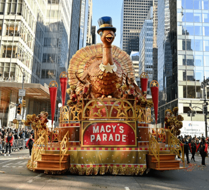 The Macy's Thanksgiving Day Parade is an annual event held in New York City on Thanksgiving Day, featuring giant balloons, floats, marching bands, and celebrity performers. It starts at 8:30 AM EST, takes place in Manhattan along a 2.5-mile route, and culminates in front of Macy's Herald Square.