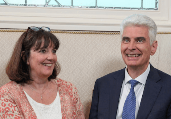 Elder Gérald Caussé and his wife, Sister Valérie Caussé, speak about his new call to the Quorum of the Twelve Apostles from the Joseph Smith Memorial Building on Temple Square in Salt Lake City on Thursday, Nov. 6, 2025