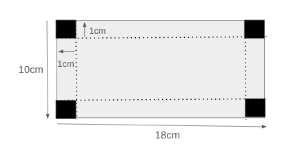 In each corner of the cardboard sheet, we cut away a square in the way the image shows. Then we fold up the cardboard sheet along the dashed lines so that we get a box. What is its volume?