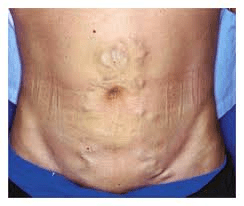 This exam finding - dilated superficial abdominal veins - can look like "a head of snakes" or the "hair of a mad woman".
