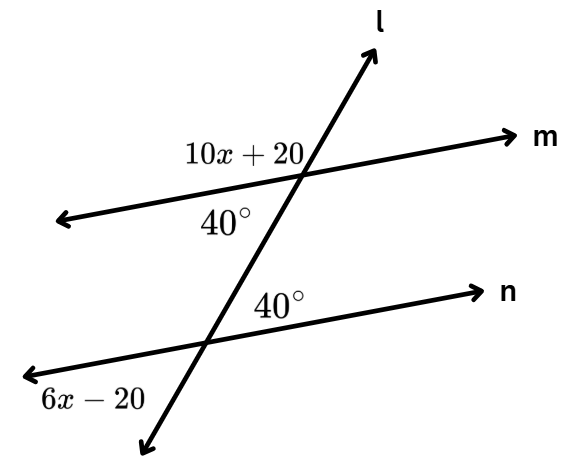 What value of x makes lines n and m parallel? Ignore the 40 degrees (do not use them).