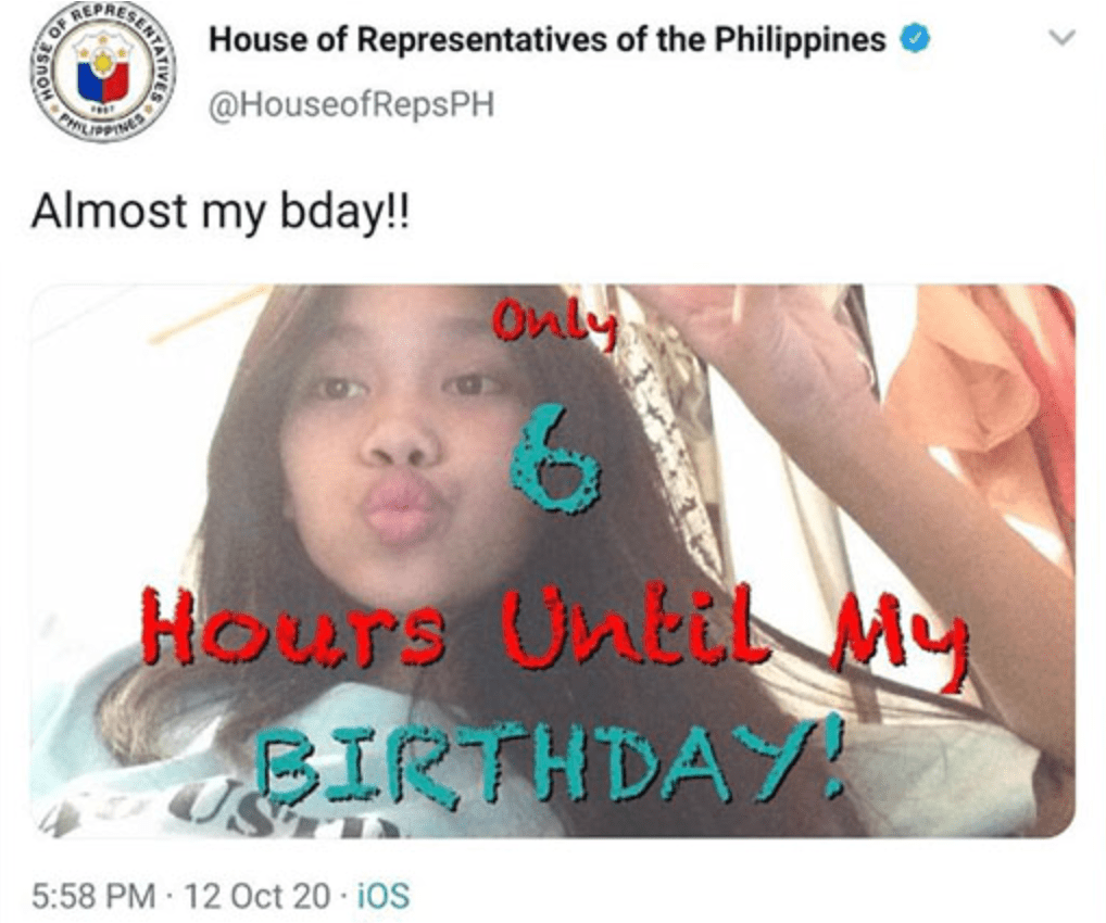 The young daughter of a politician accidentally tweeted a selfie celebrating her birthday on this country’s official House of Representatives Twitter account.