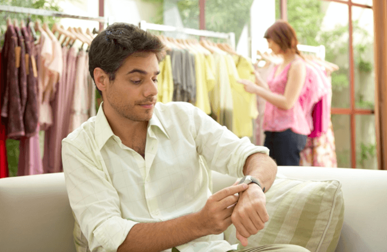 He is looking at his watch so he is probably bored and wants to leave the store.