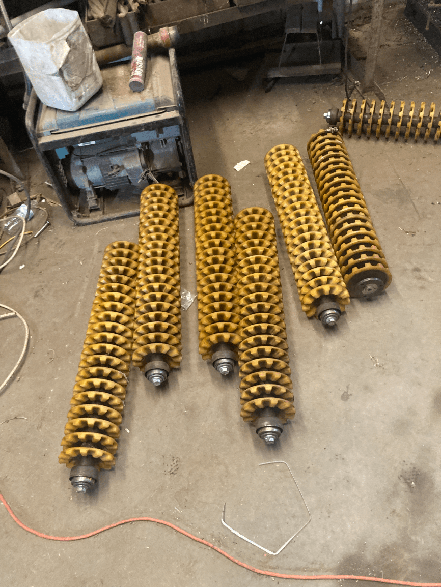 These are the parts on a cotton picker that knocks the picked cotton off the spindles as they rotate past, the cotton is then blown into the basket. They must be grinded periodically to be kept in alignment (which used to be done individually in my grandpa's time). Case IH pickers have 18 disks on the assembly, John Deere pickers have 20.