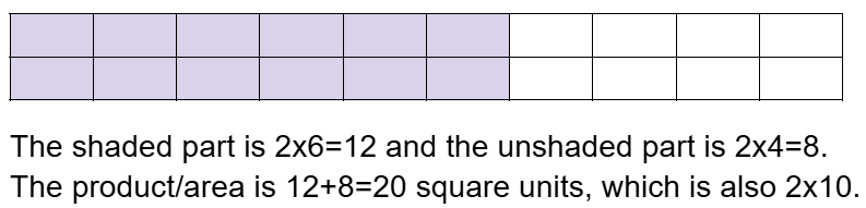 "La parte sombreada es ___ y la parte no sombreada es ___. El producto/el área es ___, que también es 2x10."