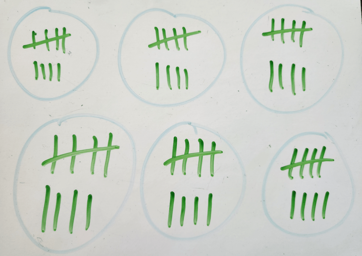 Hay 9 piezas de dulce en un frasco. Eliseo las pone en 3 bolsas iguales. ¿Cuántas piezas de dulce hay en cada bolsa?