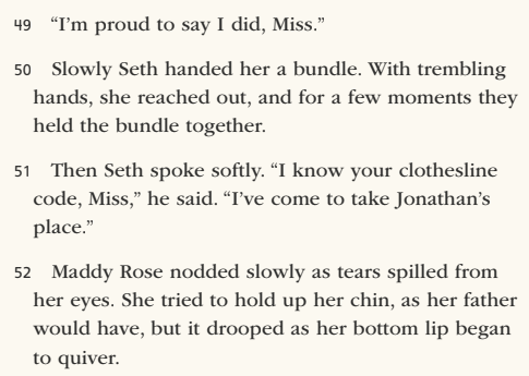 Seth is silent for a while then sadly says he "knew" her brother. Seth handed her a bundle while saying he has come to take Jonathan's place