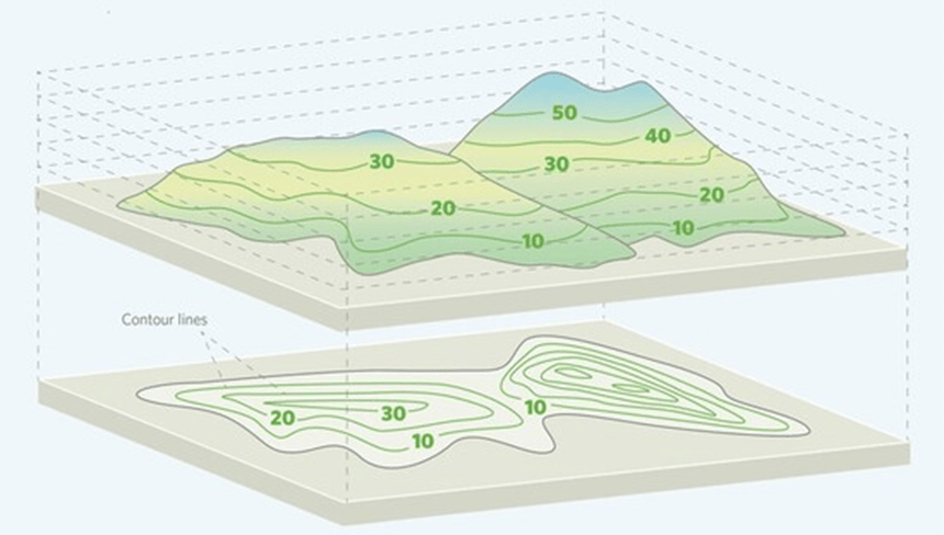 A construction company is planning to buy a piece of property to build a shopping center. How would a topographic map best help the company? Choose the two best answers.
