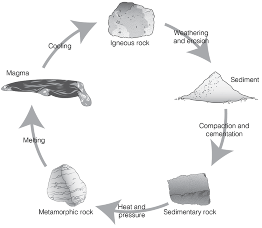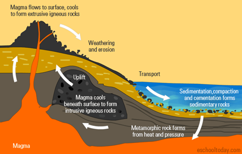 After reviewing the below diagram, what would you say that causes earth's surface to crumble and wash into the water that leads eventually to sedimentary rock?
