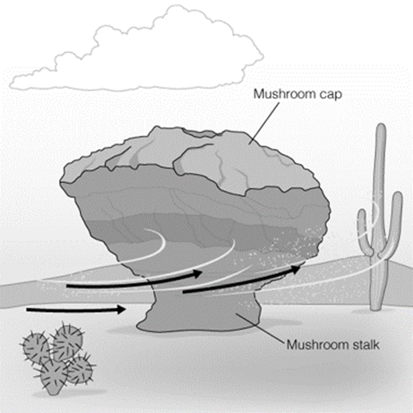 The mushroom cap is most likely made of (1)_______ (softer / harder) rock. The mushroom stalk is most likely made up of (2)_______ (harder / softer) rock.