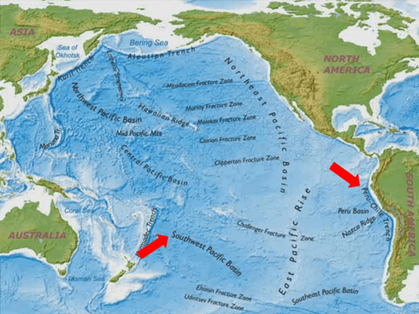 The Peru-Chile Trench is a long, narrow, (1)_______ (sunken area / raised area) in the ocean floor. The Southwest Pacific Basin is an area of large (2)_______ (mountains / flat plains) located underwater.