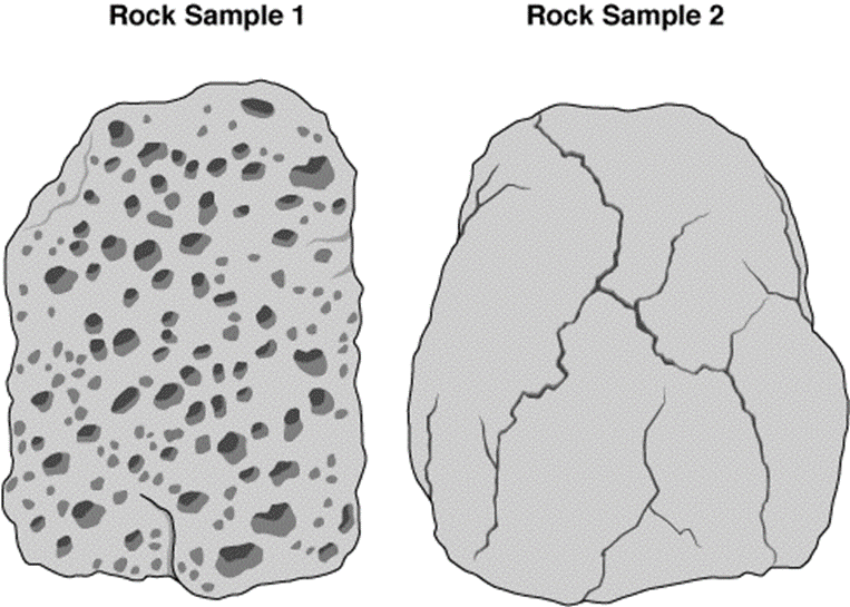 Rock Sample 1 is an example of (1)_______ (physical weathering / chemical weathering). Rock Sample 2 is an example of (2)_______ (chemical weathering / physical weathering).