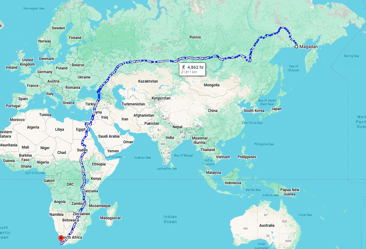 You can walk from Magadan in Russia to Cape Town in South Africa. Equivalent to walking across the USA 5 times!