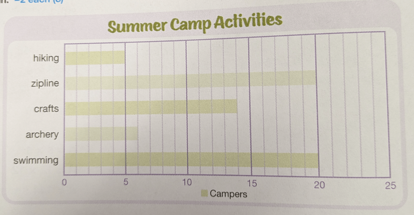 This graph shows the activities campers choose during their week at camp. Use the data from the graph to write the range, mode, mean, and median