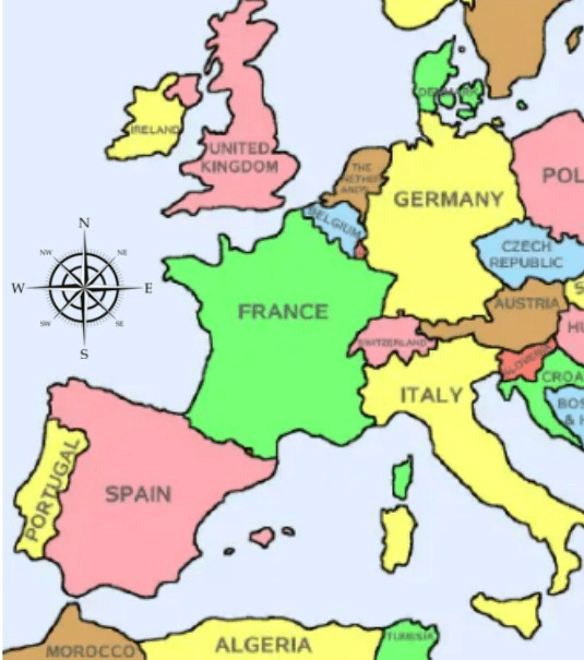 France is northeast of Spain. France is west of Italy and Switzerland. France is southwest of Germany and Belgium.
