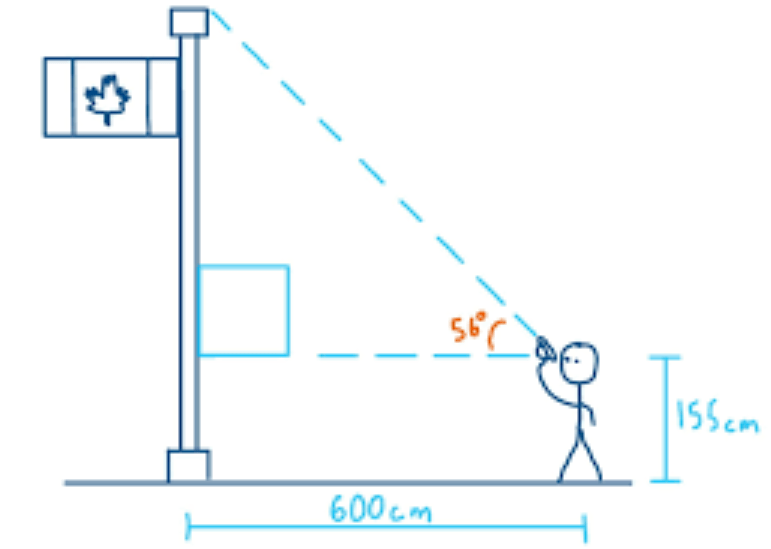 Alan is measuring a flagpole. The height from the ground to Alan's eyes is 155cm. He is standing 600cm away from the flagpole. How tall is the flagpole? Round to the nearest whole number of centimeters.