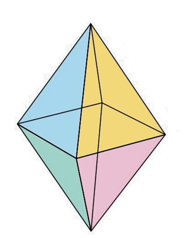 Maruška vyrobila z papiera dve rovnaké pyramídy a zlepila ich spodnými stranami dokopy. Vzniklo tak teleso na obrázku. Koľko má stien?