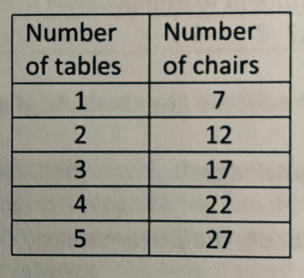 Using a letter variable, what is the pattern rule that describes the relationship between the number of tables and the number of chairs:
