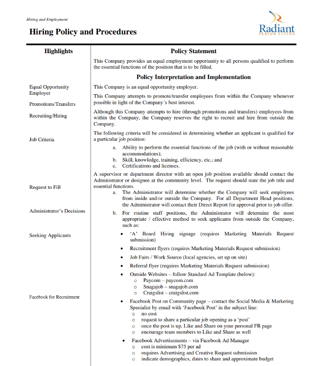 What policy do we follow to ensure we are set up for success to recruit and hire new employees?