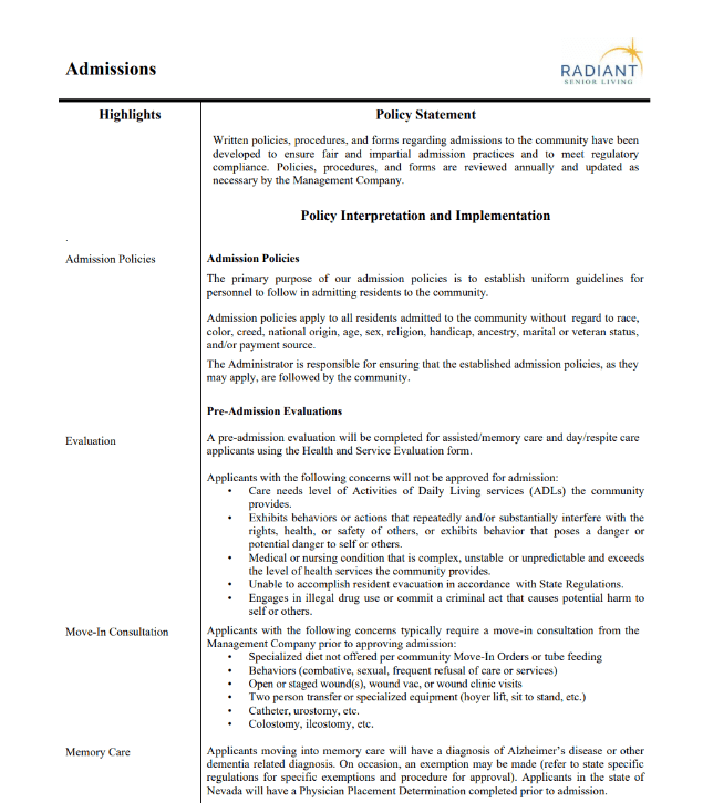 What policy do we follow to ensure we are set up for success for a resident moving in?