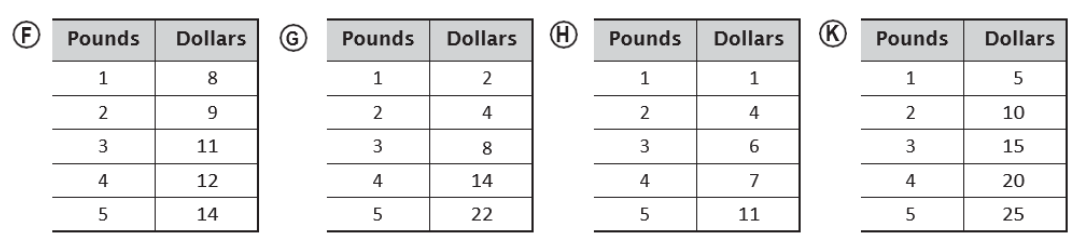 K, because the it has a constant unit rate of 5 dollars per pound.