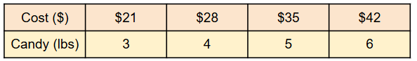 Using this table only, write as many expressions as you can to figure out how much you would pay for 8 pounds of Halloween Candy.