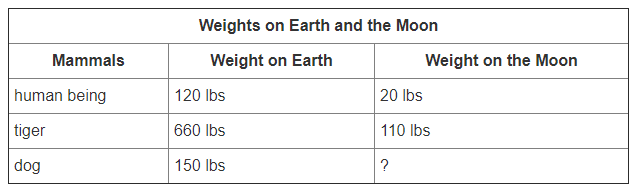 Since the moon's gravity is less than Earth's, all objects, including mammals, have different weights on the moon than on Earth. Use the table below to calculate how much a dog weighs on the moon.